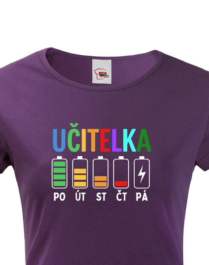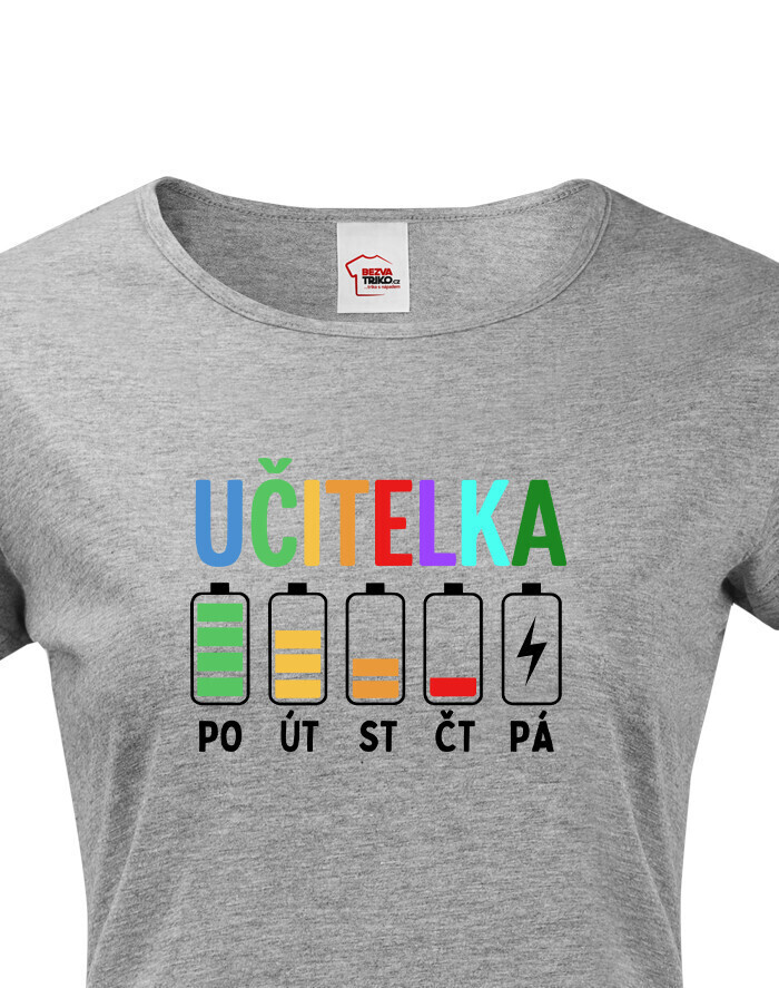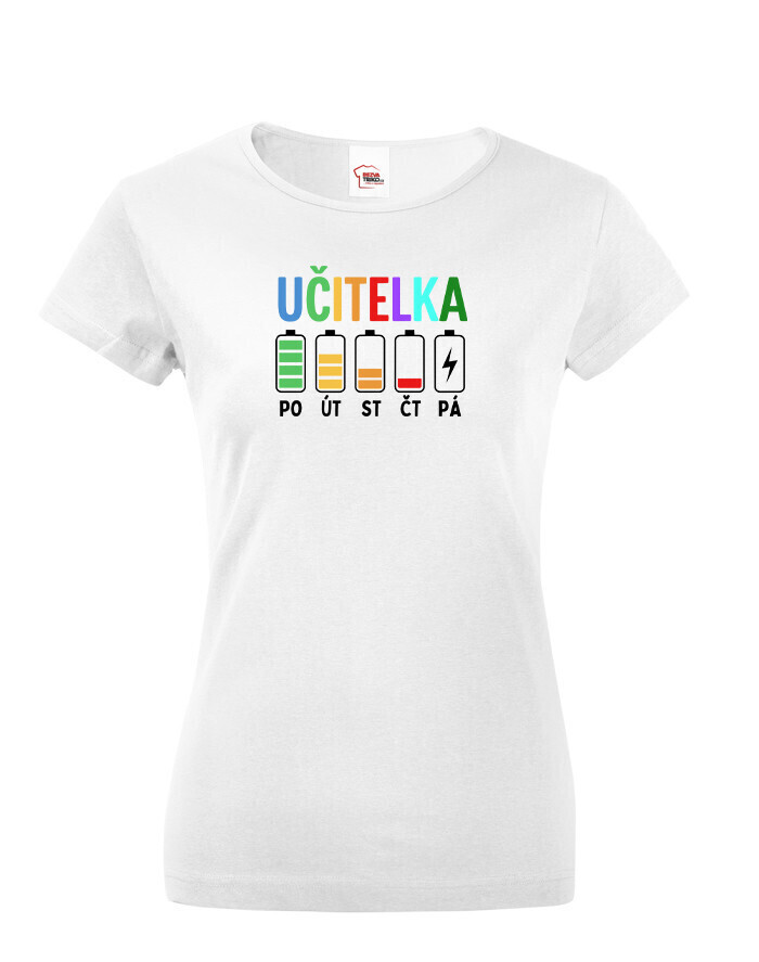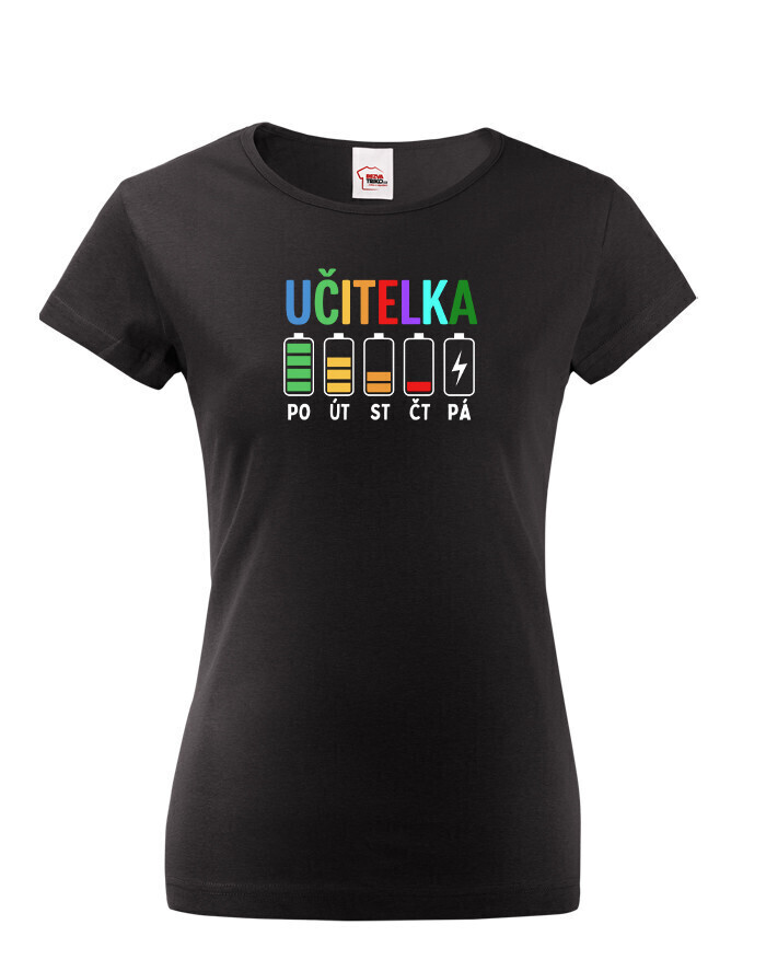 Farebný motív s nápisom „Učiteľka“ a batériami od pondelka do piatku je vtipný, trefný a veľmi pravdivý. Každá kolegyňa, žiak aj rodič hneď pochopí, o čo ide. Ide o ideálny kúsok pre všetky ženy, ktoré učia a dávajú do svojej práce maximum.