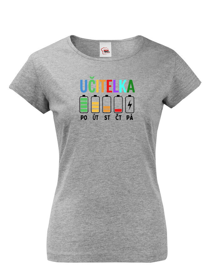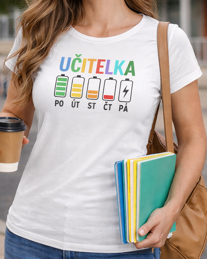 Pondelok ešte ide. Utorok tiež. Streda už trochu bolí… a piatok? Tam ideš na posledné percentá. Dámske tričko s motívom učiteľských „batérií“ počas týždňa presne vystihuje realitu každej učiteľky. Pretože kto učí, ten vie, že energia ubúda rýchlejšie než káva v zborovni.
