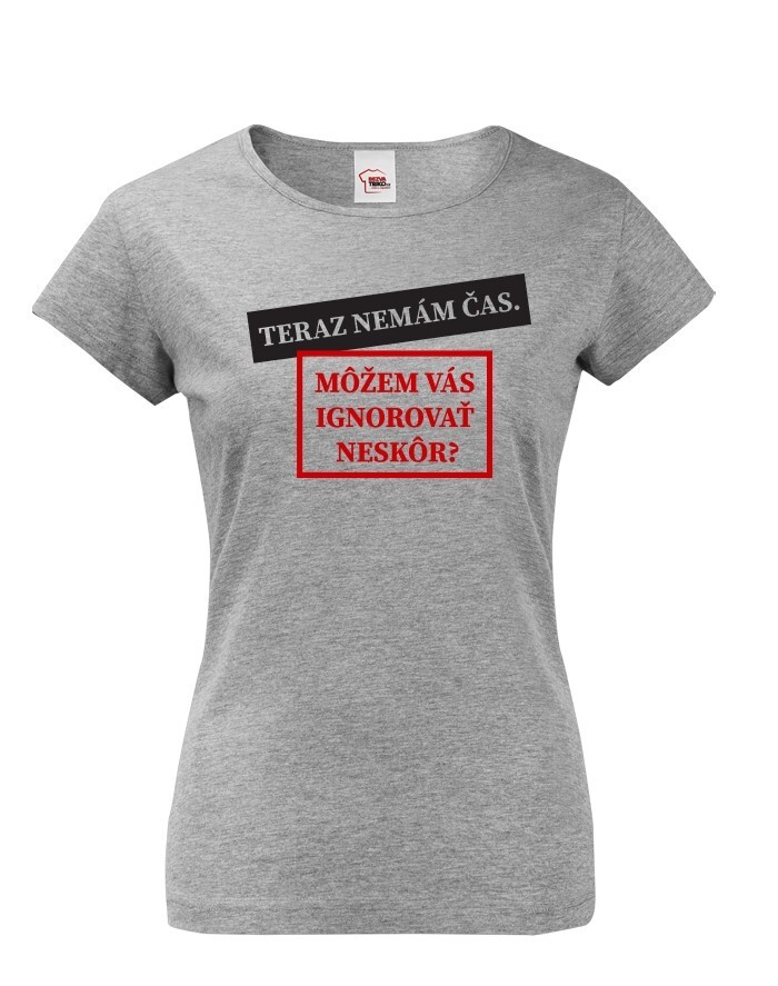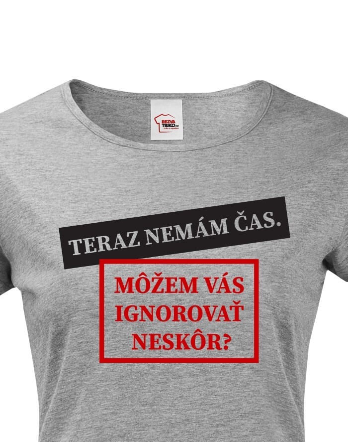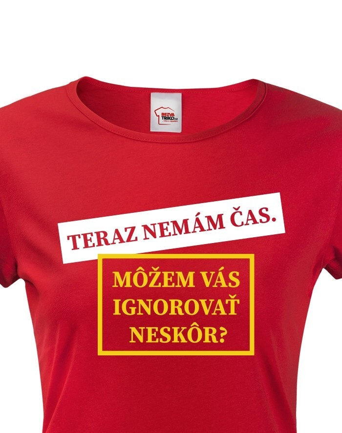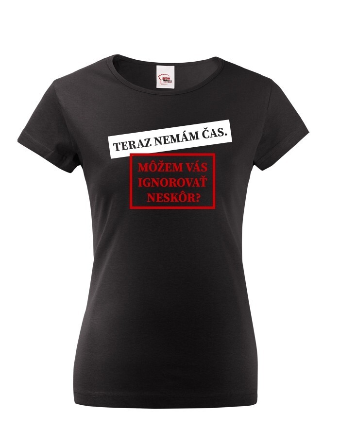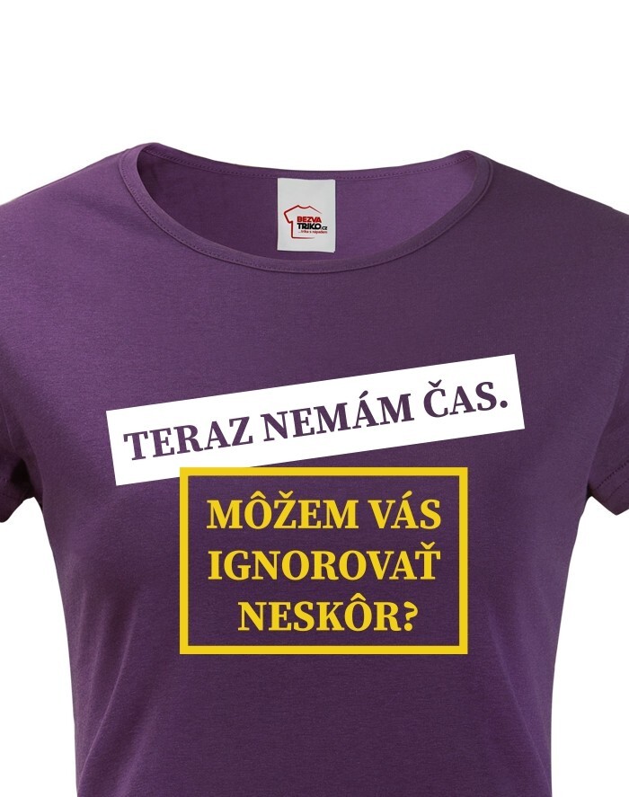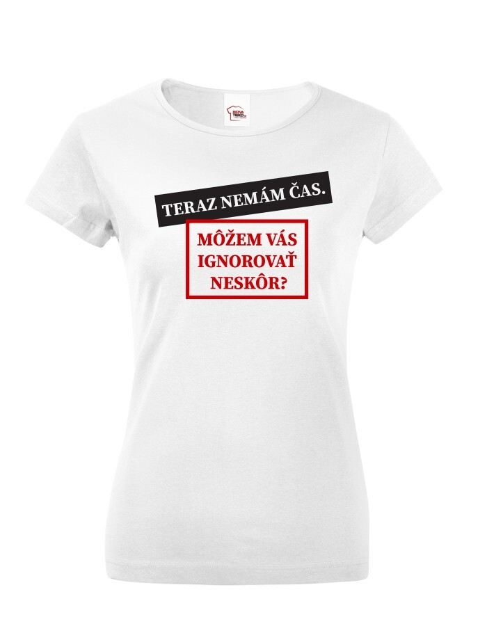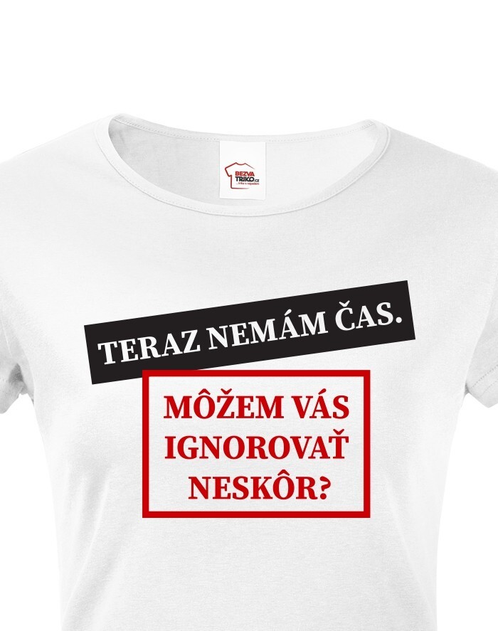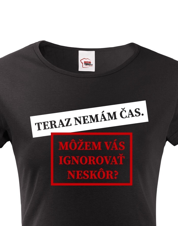Tričko s potlačou so štýlovou hláškou Teraz nemám čas. Môžem Vás ignorovať neskôr? vás dokonalo zbaví všetkých nežiadúcich indivíduí vo vašom okolí. Nemusíte nič zložito vysvetľovať, všetko za vás jasne a zrozumiteľne povie nápis na tričku. Vyzbroj sa touto štýlovkou napríklad do práce a uvidíš, ako nadchne okolie.