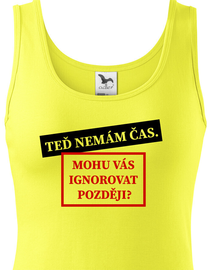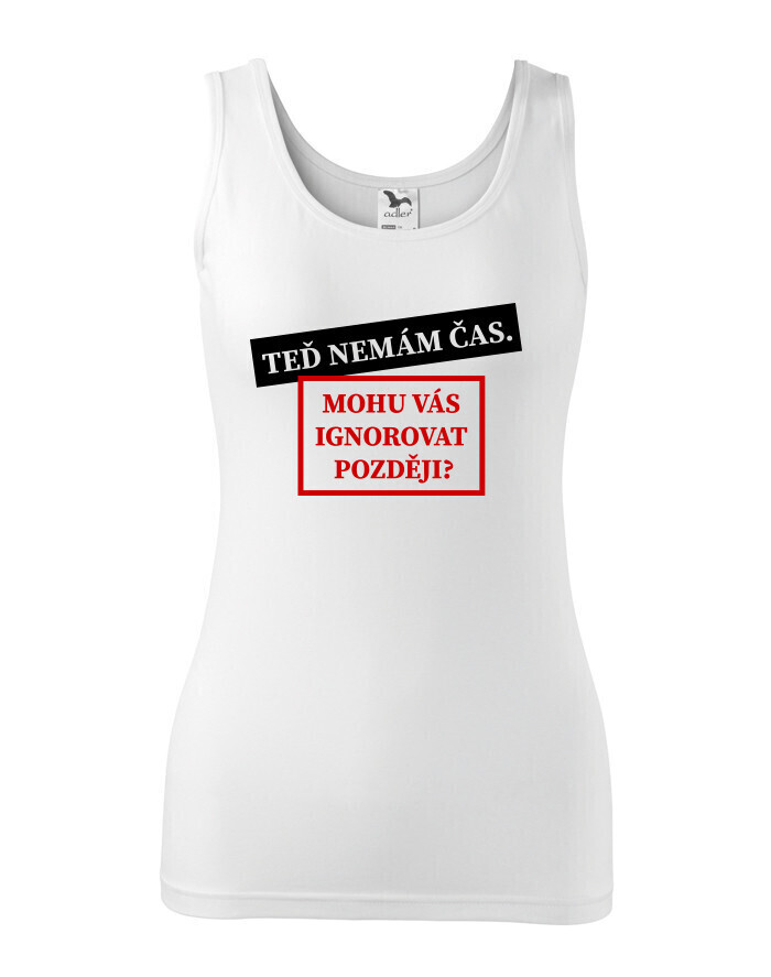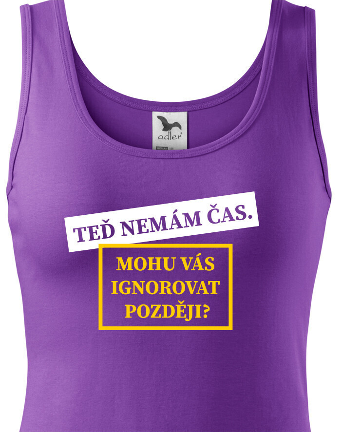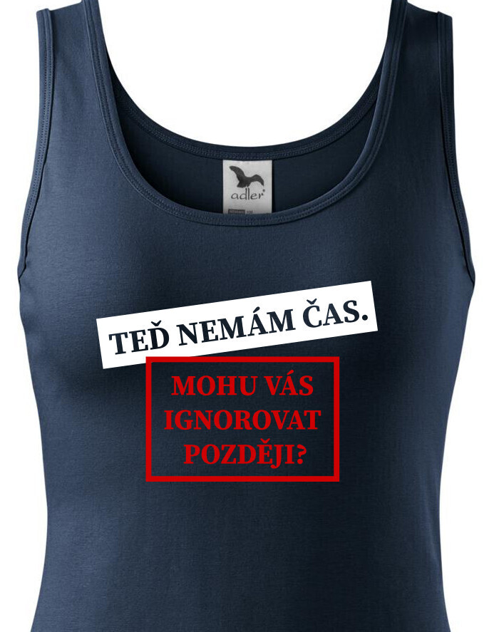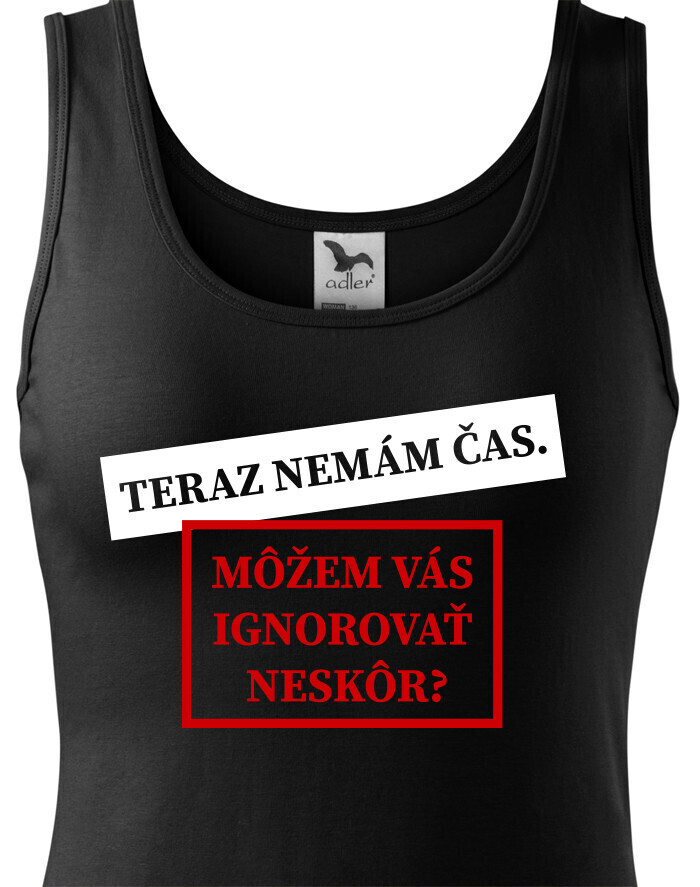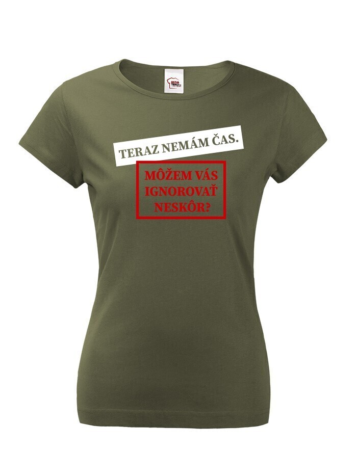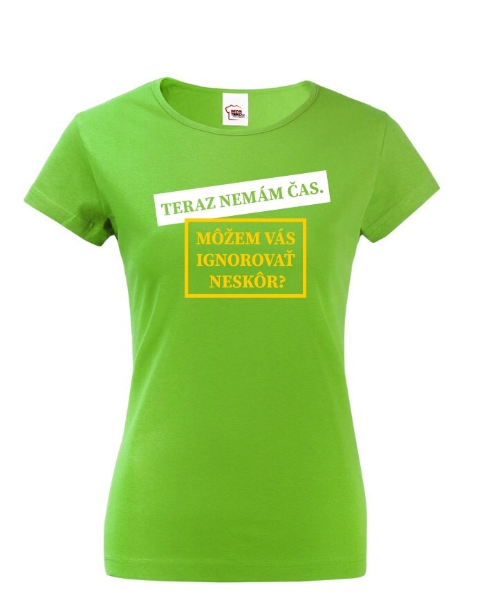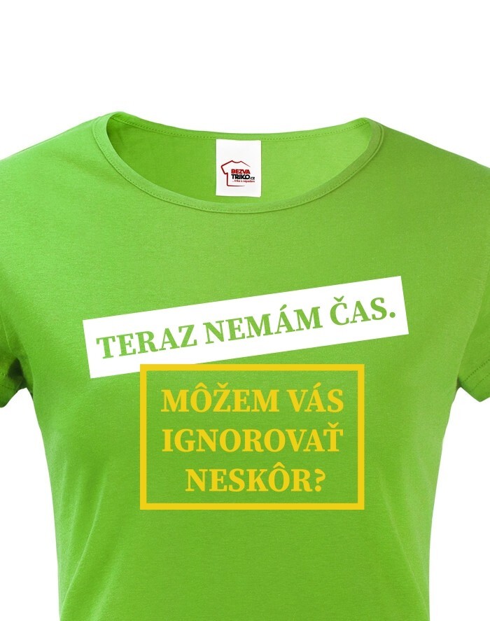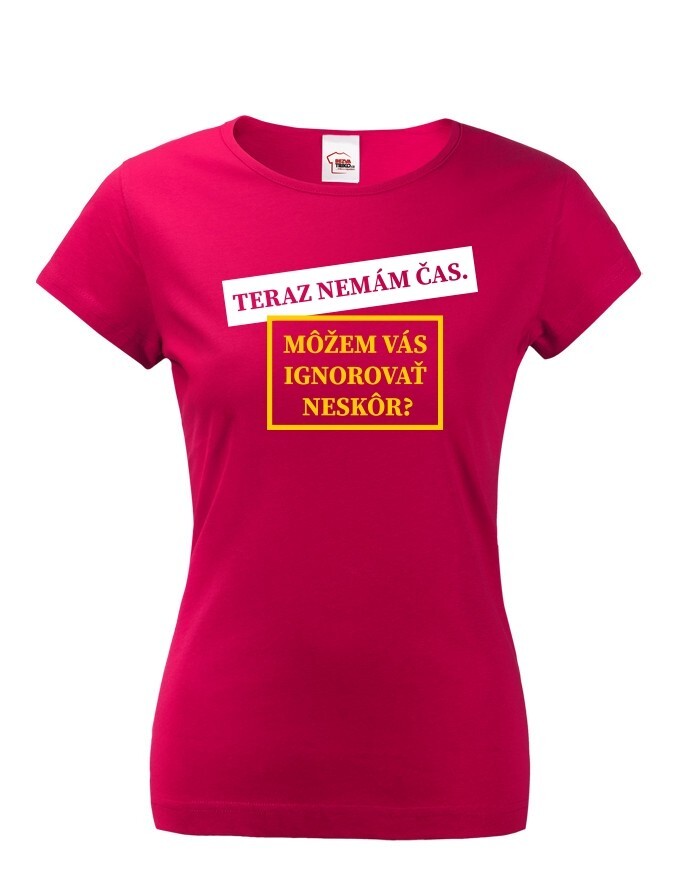Tričko s potlačou so štýlovou hláškou Teraz nemám čas. Môžem Vás ignorovať neskôr? vás dokonalo zbaví všetkých nežiadúcich indivíduí vo vašom okolí. Nemusíte nič zložito vysvetľovať, všetko za vás jasne a zrozumiteľne povie nápis na tričku. Vyzbroj sa touto štýlovkou napríklad do práce a uvidíš, ako nadchne okolie.