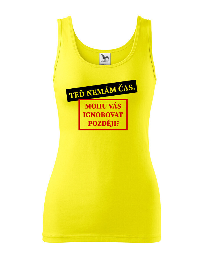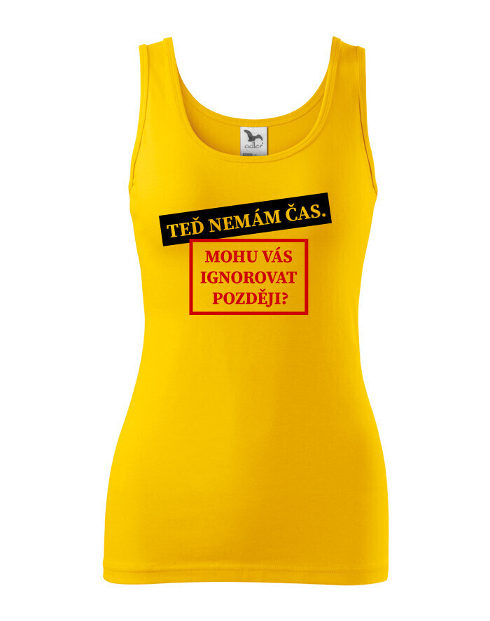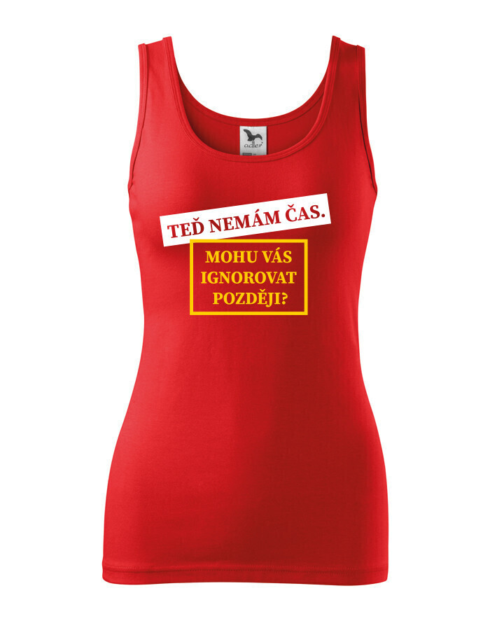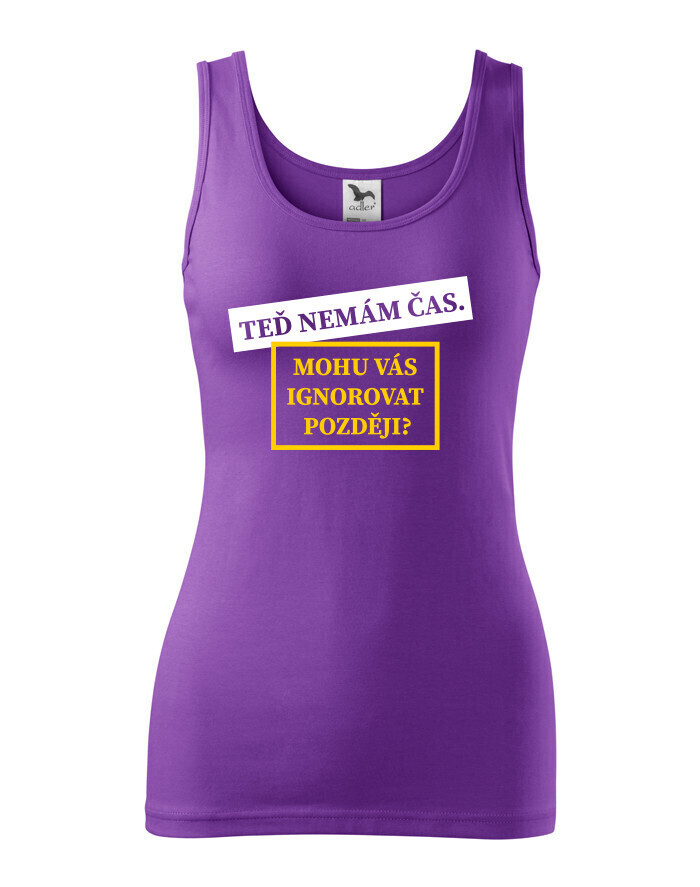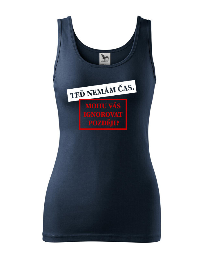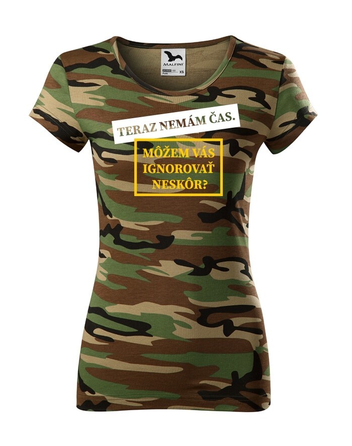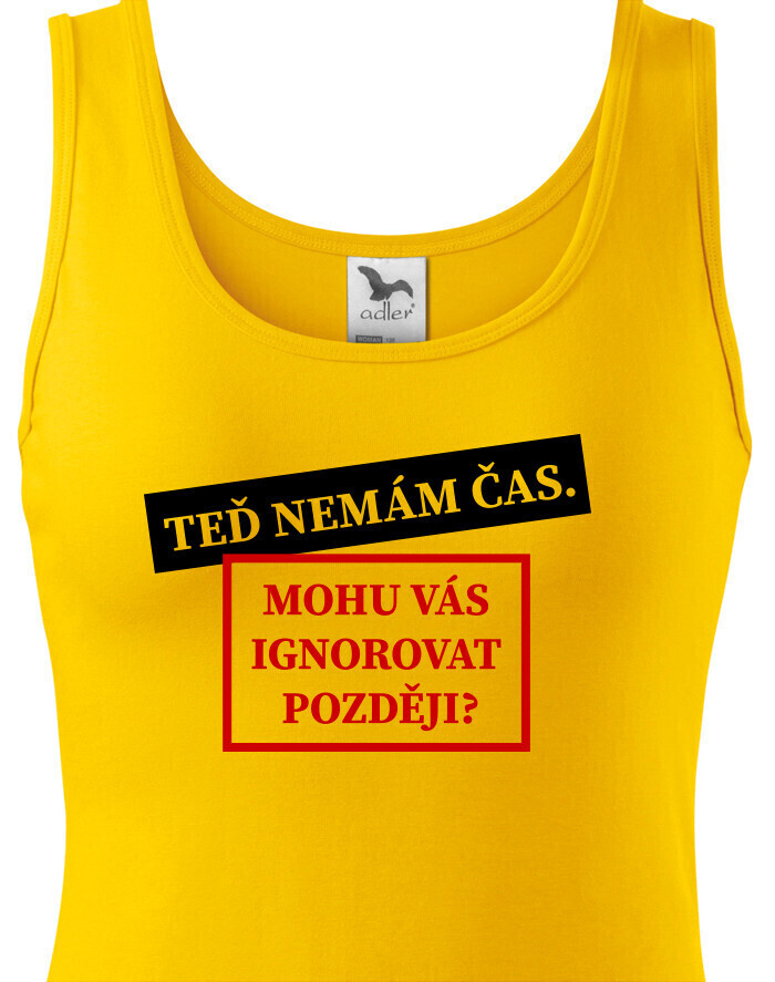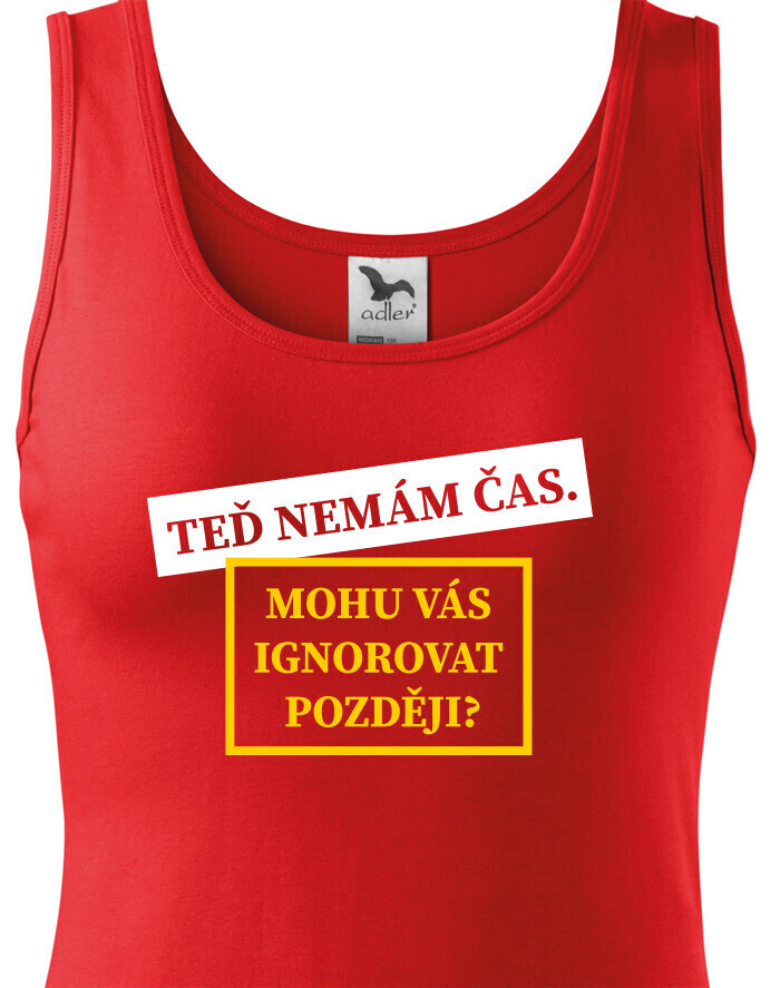 Tričko s potlačou so štýlovou hláškou Teraz nemám čas. Môžem Vás ignorovať neskôr? vás dokonalo zbaví všetkých nežiadúcich indivíduí vo vašom okolí. Nemusíte nič zložito vysvetľovať, všetko za vás jasne a zrozumiteľne povie nápis na tričku. Vyzbroj sa touto štýlovkou napríklad do práce a uvidíš, ako nadchne okolie.