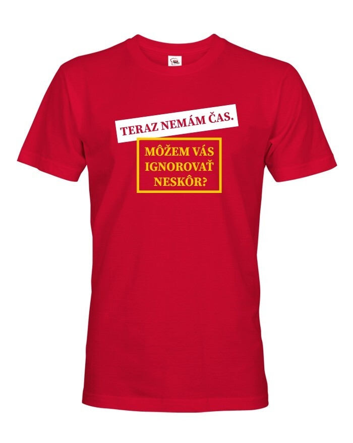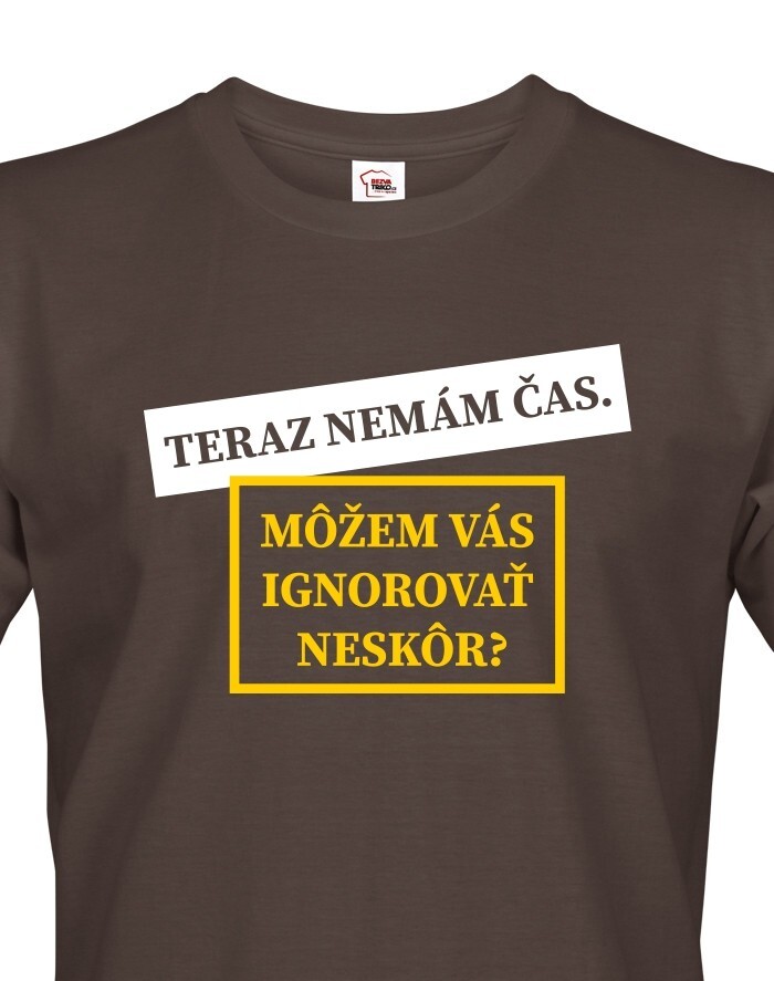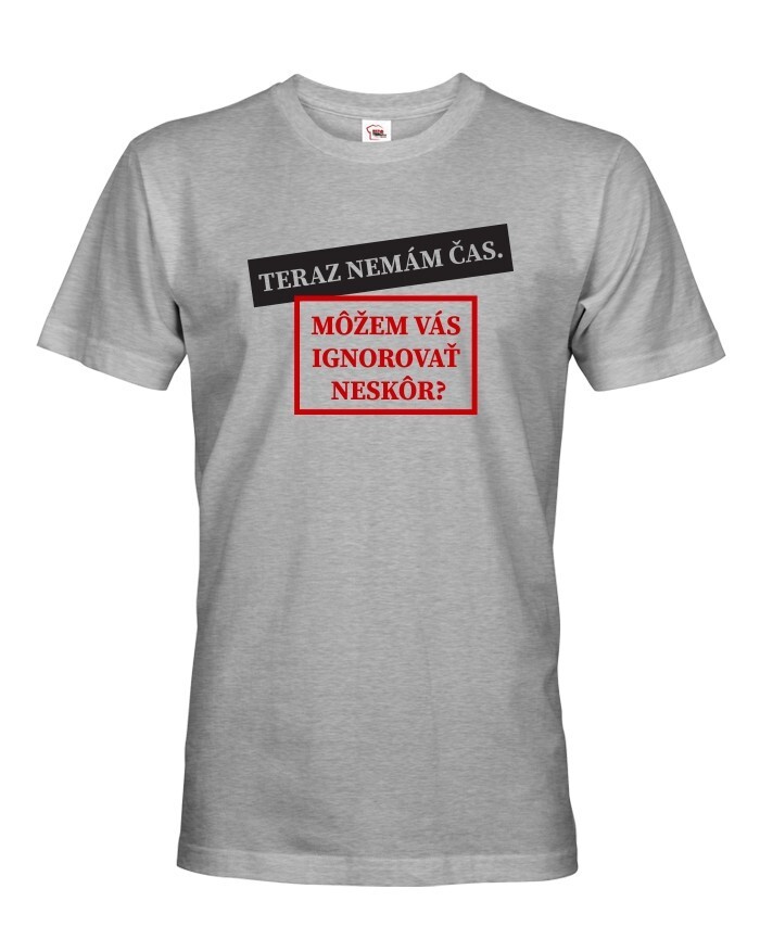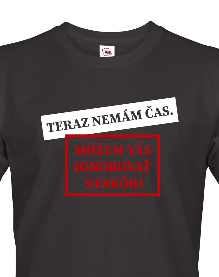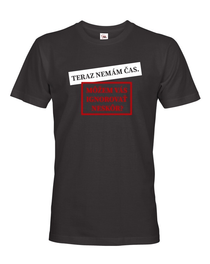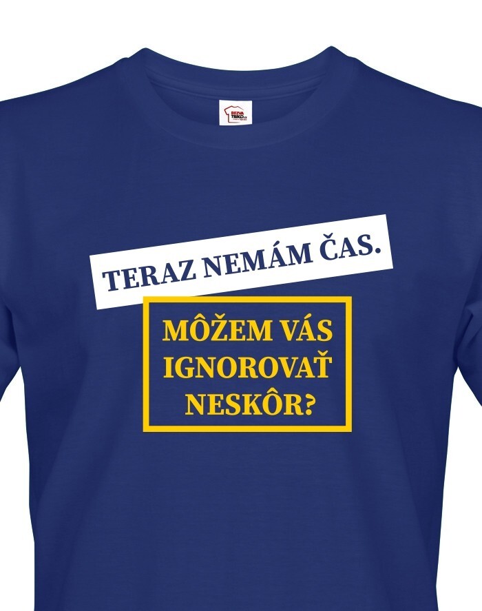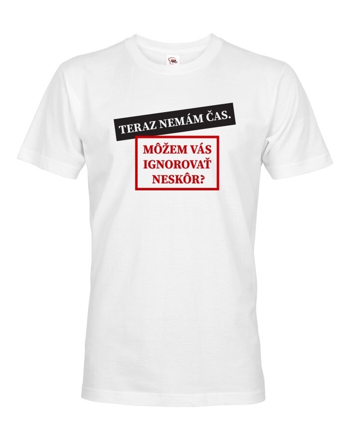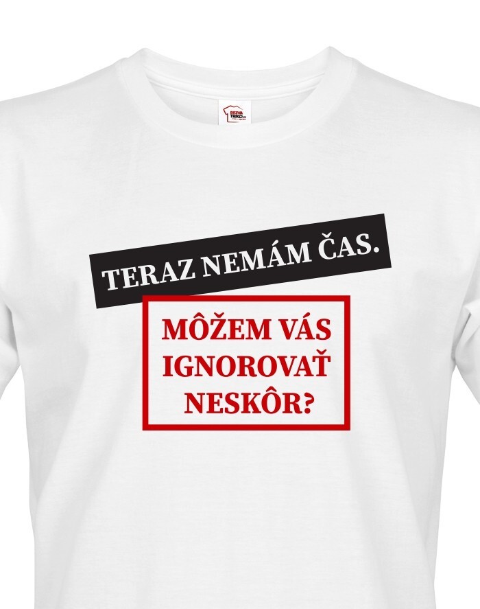 Tričko s potlačou so štýlovou hláškou Teraz nemám čas. Môžem Vás ignorovať neskôr? vás dokonalo zbaví všetkých nežiadúcich indivíduí vo vašom okolí. Nemusíte nič zložito vysvetľovať, všetko za vás jasne a zrozumiteľne povie nápis na tričku. Vyzbroj sa touto štýlovkou napríklad do práce a uvidíš, ako nadchne okolie.