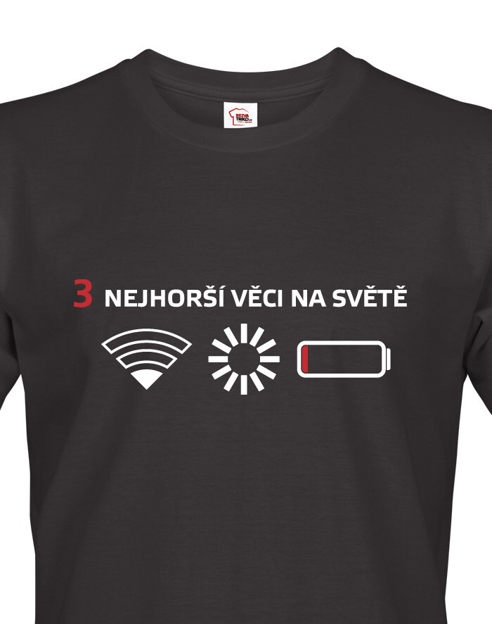 Prezrieť hodnotenie na Heureka.skPremýšľali ste niekedy nad tým, čo sú tri najhoršie veci na svete? Ak nie, tak už nemusíte. Máme pre vás jednoznačnú odpoveď - slabý signal WIFI, zaseknutá appka a dochádzajúca batéria. Naša vtipné tričko s potlačou nebezpečne reflektuje dnešnú dobu, keď bez mobilného telefónu nikto nedá ani ranu.